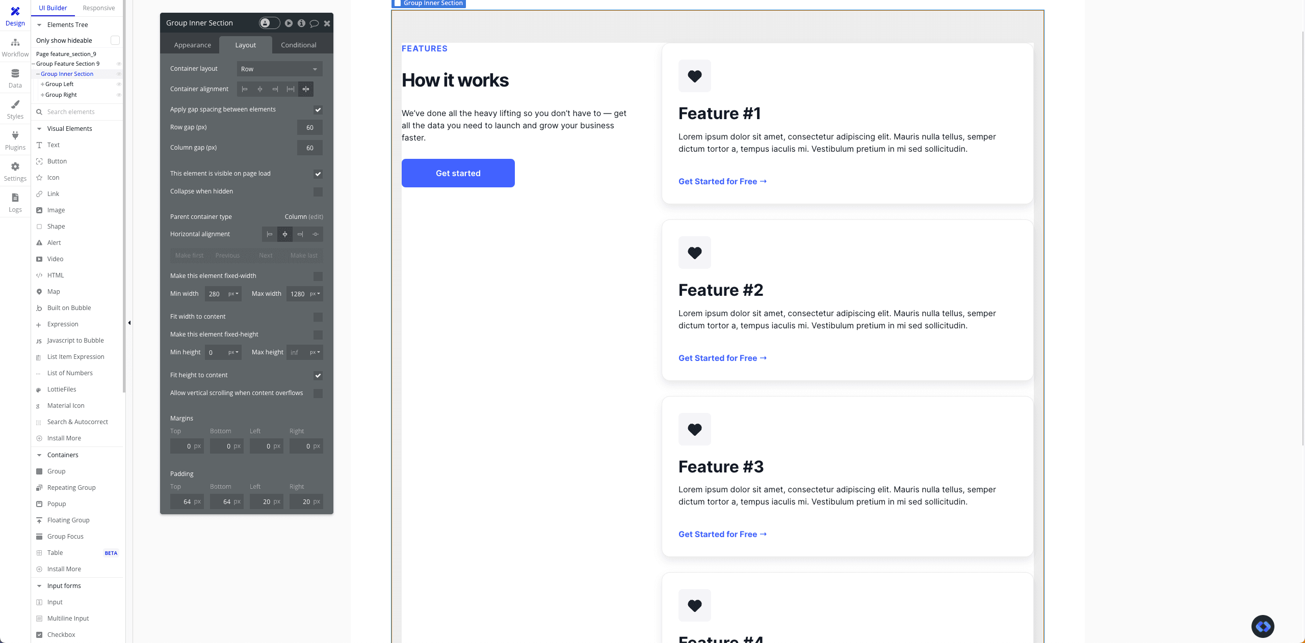 Let's start by creating our groups. In this example, we are going to create the following feature section (which is available on Nocodable Components).