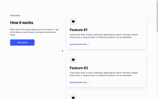 Inside the container, there is one container on the left that contains a CTA Button, and one other container on the right that contains all the cards presenting the features.