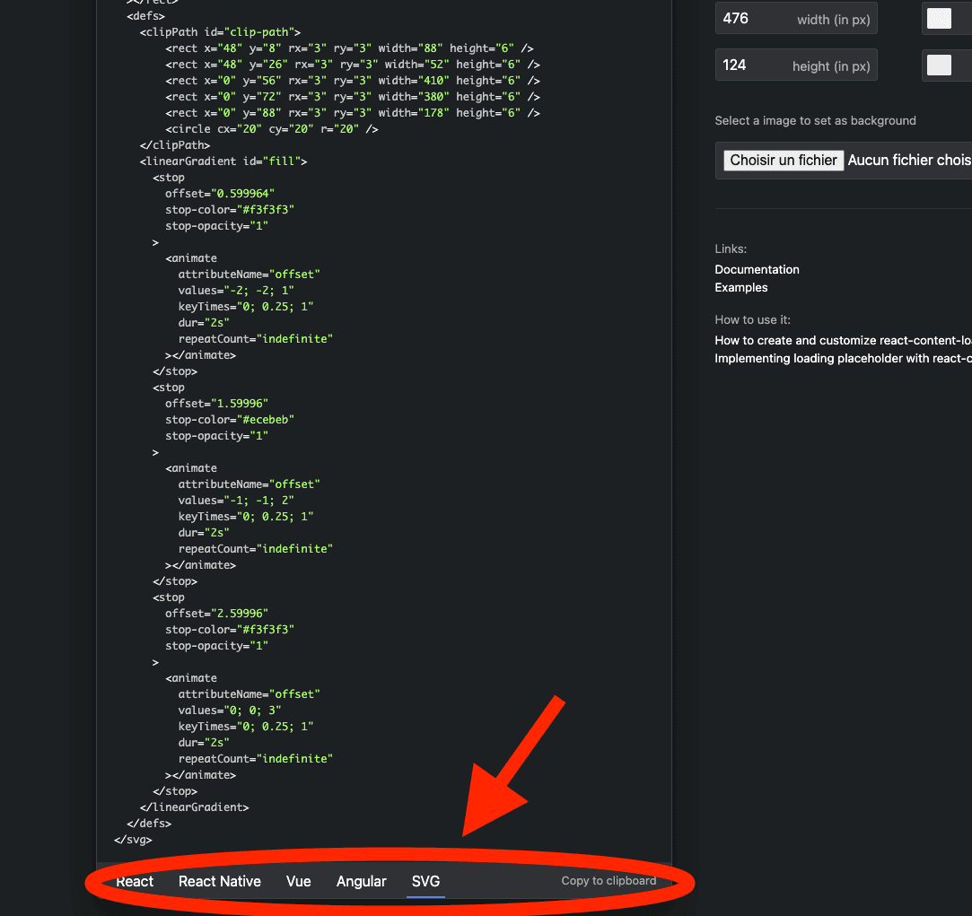 Once you've create your loader, click SVG and Copy to Clipboard.